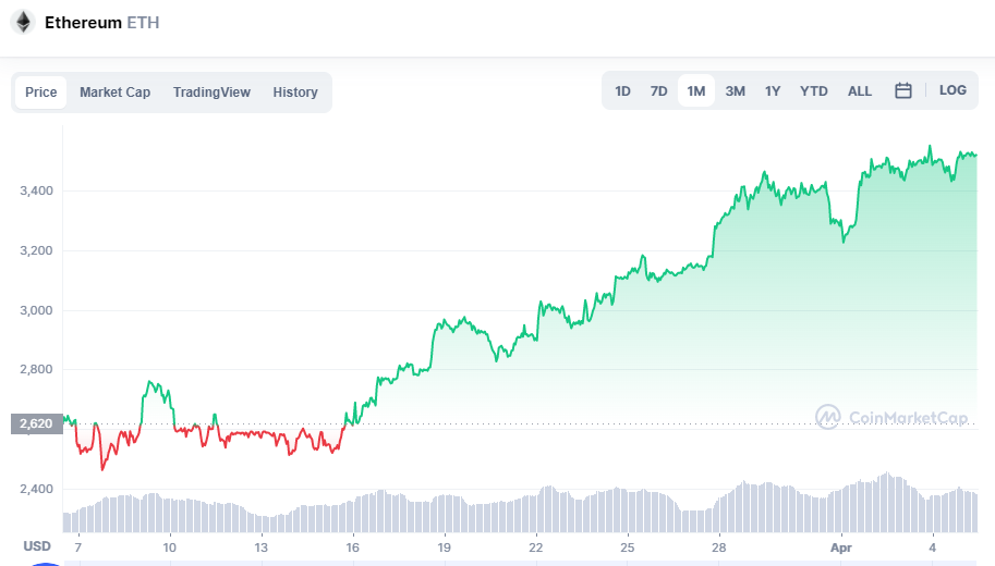 While Ethereum (ETH) remains the primary blockchain on which the majority of DeFi applications are built, the altcoin market as a whole tends to be driven by its performance. Ether has risen nearly 2% in only the last 24 hours, reaching a price of $3,519, at the time of writing. The graph below demonstrates its performance over the last month, and indicates that Ethereum (ETH) is ascending expeditiously.