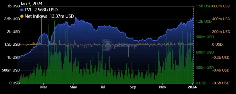Data from DefiLlama shows the TVL on Arbitrum-based applications has increased by $1 billion since October, alongside an increase in net inflows.