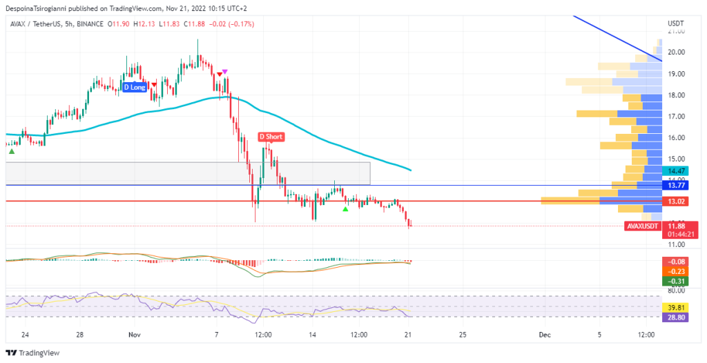 In the 5-hour chart, AVAX dropped below the 50 SMMA line of $14.47. The Volume Profile indicator identifies $13.02 as a strong trading area which surpassed. Moreover, the price continues fluctuating below the previous bottom of the last drop.