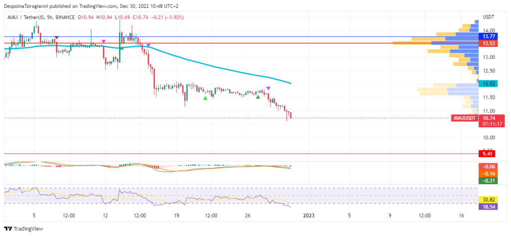 AVAX price analysis for 30 December 2022, AVAX, the twentieth-largest cryptocurrency based on market cap, is in a downtrend since November 2021. You can read more about AVAX price from CoinCodex. On the fifth day of this week, it seems that sellers try to control the price based on the weekly Heikin Ashi Candlestick. The weekly MACD is still negative but forms a positive histogram. The weekly RSI fluctuates below 50. The price is still under the 50 SMMA line.
