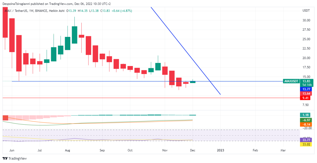 AVAX price analysis for 6 December 2022, AVAX, the twentieth-largest cryptocurrency based on market cap, is in a downtrend since November 2021. You can read more about AVAX price from CoinCodex. On the second day of this week, it seems that buyers take control of the price based on the weekly Heikin Ashi Candlestick. The weekly MACD is still negative but forms a positive histogram. The weekly RSI fluctuates below 50. The price is still under the 50 SMMA line.