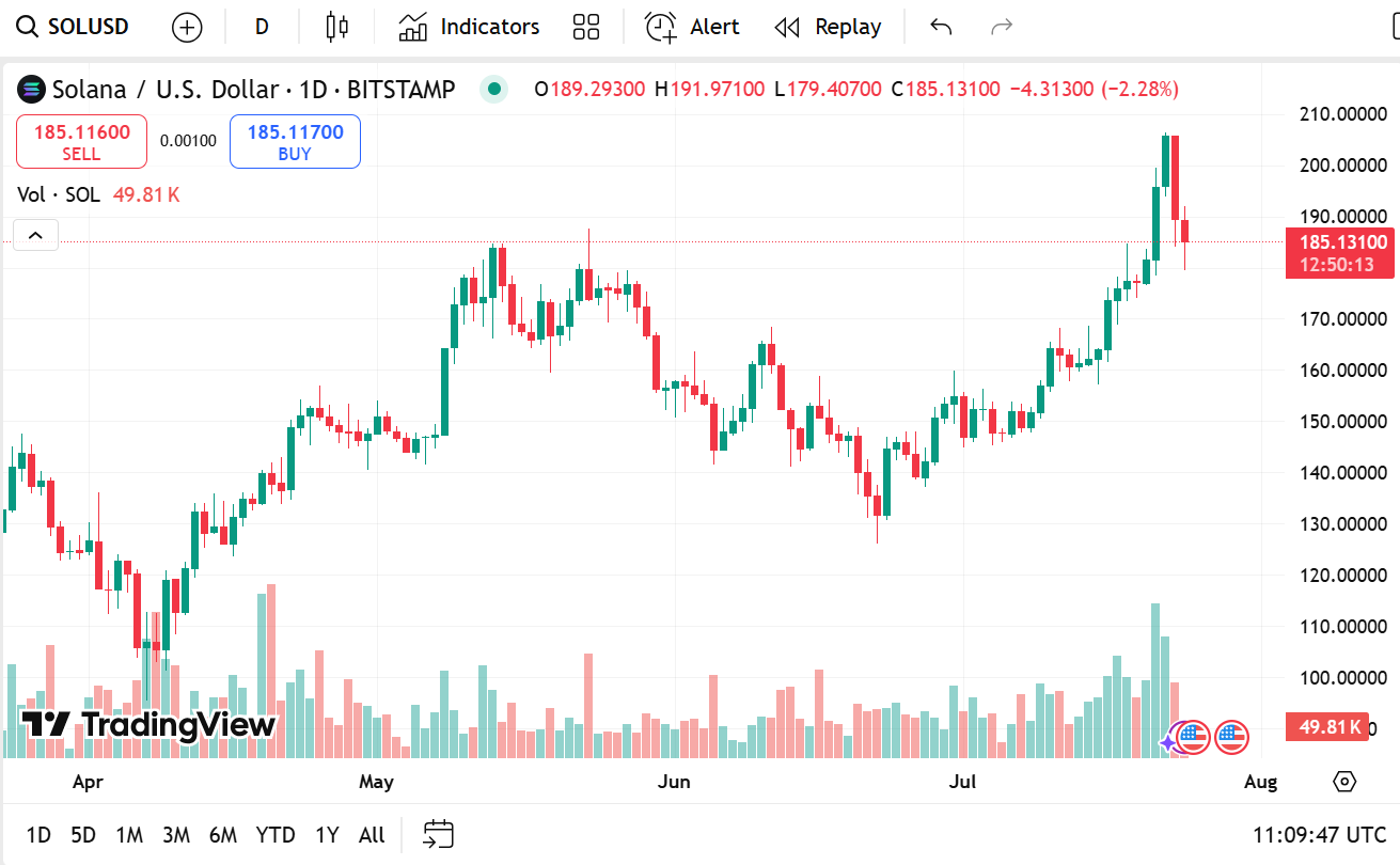 Solana (SOL), the erstwhile “Ethereum killer,” was trading at $184.52, a 6.79% dip in the last twenty-four hours. Its market cap is still at $99.48 billion, with trading volume showing a 14.1% increase to now at $11.49 billion.