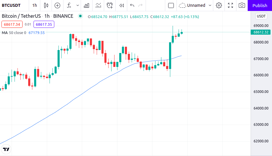 As per the data by TradingView, the king coin rose by $2,000 in 45 minutes which is clearly visible through a huge green candle in the hourly chart. We can see from TheCoinRise latest reports that BTC has reversed its minor downside movement and now breached its previous ATH at $68,500.