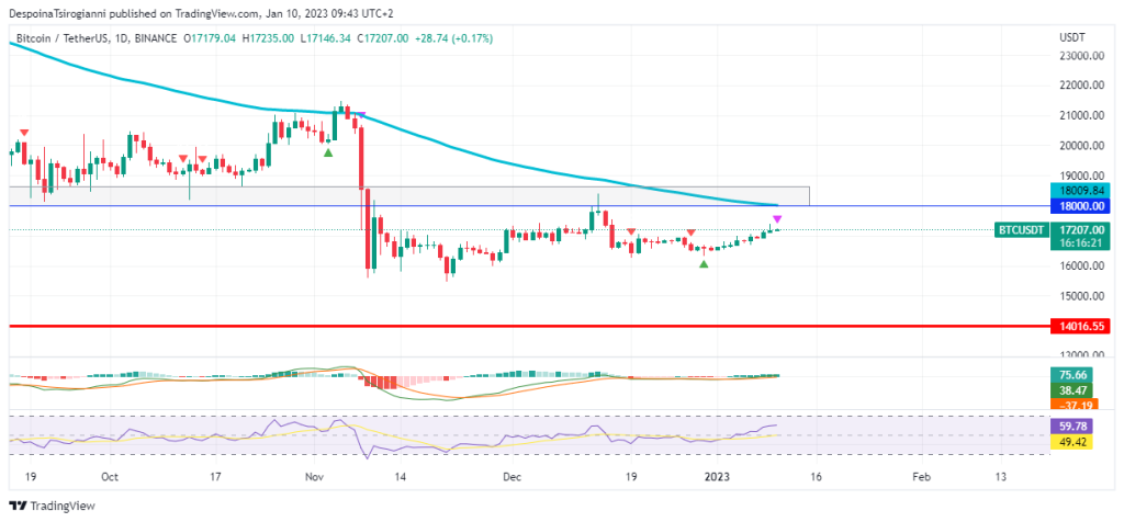 In the 5-hour chart, Bitcoin fluctuates above the 50 SMMA line of $16872.65. The Volume Profile indicator determines $16833.62 as a strong trading area that has been surpassed too.