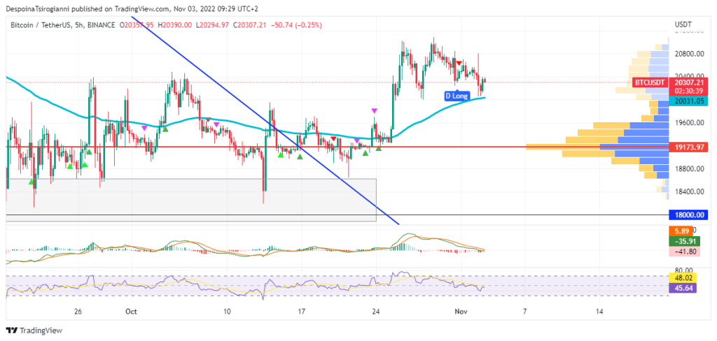 Bitcoin price analysis for 3 November 2022, Bitcoin, the first largest cryptocurrency based on market cap, is in a downtrend since November 2021. You can read more about Bitcoin price from CoinCodex. On the fourth day of this week, it seems that buyers take control of the price based on the weekly Heikin Ashi Candlestick. The weekly MACD is still negative but forms a positive histogram. The weekly RSI fluctuates below 50 but is close to the oversold zone. The price is still under the 50 SMMA line.
