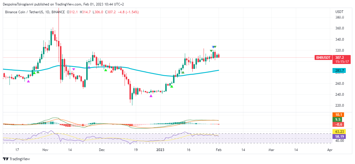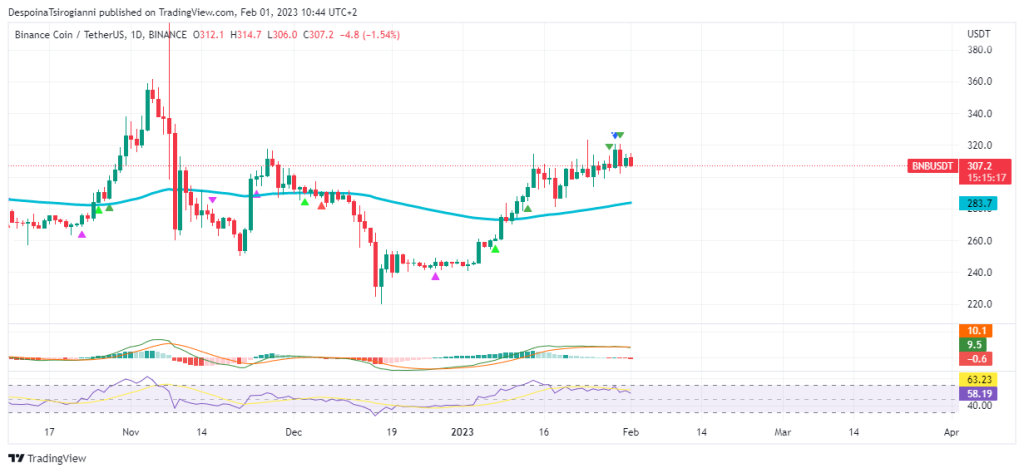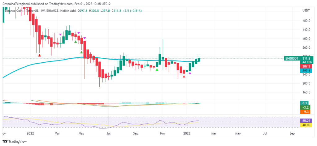 BNB price analysis for 1 February 2023, BNB, the fifth largest cryptocurrency based on market cap, is in a downtrend since November 2021. The downtrend broke in August but the 50 weekly SMMA stood as resistance. You can read more about BNB price from CoinCodex. On the third day of this week, it seems that buyers try to control the price based on the weekly Heikin Ashi Candlestick. The weekly MACD is negative with a positive histogram and the RSI fluctuates over 50.
