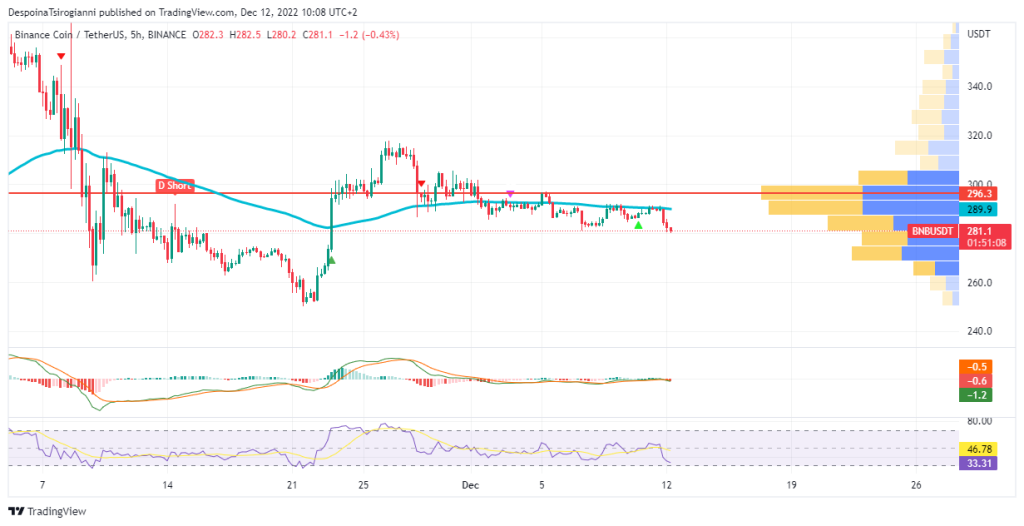 In the 5-hour chart, BNB drags lower. The price fluctuates below the 50 SMMA ($289.9) after rejecting it. The Volume Profile indicator determines $296.3 as a strong trading area, and the price fluctuates below it.