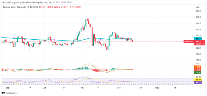 BNB price analysis for 12 December 2022, BNB, the fifth largest cryptocurrency based on market cap, is in a downtrend since November 2021. The downtrend broke in August but the 50 weekly SMMA stood as resistance. You can read more about BNB price from CoinCodex. On the first day of this week, it seems that sellers try to control the price based on the weekly Heikin Ashi Candlestick. The weekly MACD is negative with a positive histogram and the RSI fluctuates below 50.