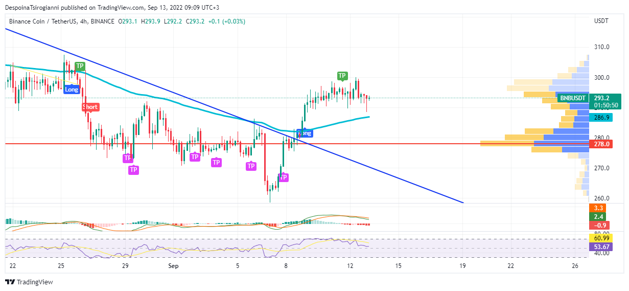 In the 4-hour chart BNB broke above the downtrend trendline and the 50 SMMA ($286.9). The Volume Profile indicator determines $278 as a strong trading area. A retest back to the 50 SMMA or Volume profile is possible.