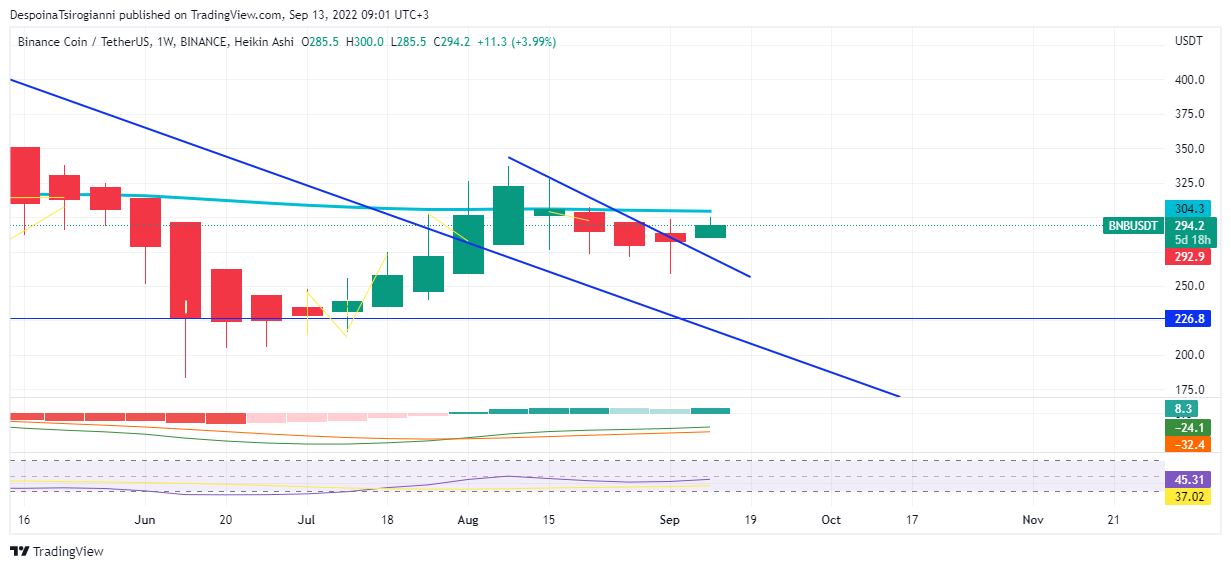 BNB price analysis for 13 September 2022, BNB, the third largest cryptocurrency based on market cap, is in a downtrend since November 2021. The downtrend broke in August but the 50 weekly SMMA stood as resistance. Additionally, this week it seems that BNB is under buyers’ pressure based on the weekly Heikin Ashi Candlestick. The weekly MACD and the RSI are still in negative areas.
