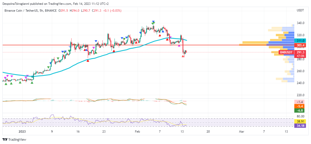 In the 5-hour chart, BNB dropped below the 50 SMMA ($311.0). The Volume Profile indicator determines $303.4 as strong trading area that has been surpassed. The price moves lower after the retest back to to 50 SMMA.