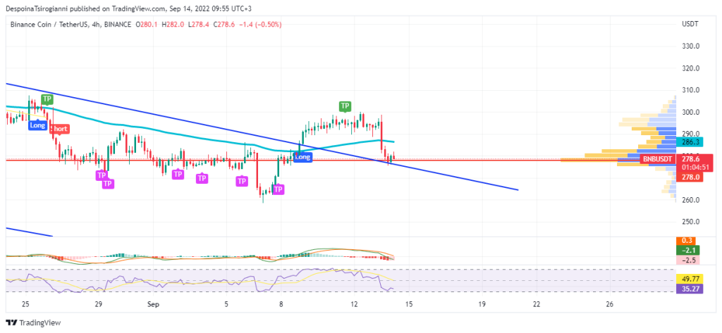 In the 4-hour chart BNB broke under the 50 SMMA ($286.3) but still fluctuates above the downtrend. The Volume Profile indicator determines $278 as a strong trading area. A retest back to the 50 SMMA is possible.