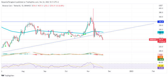 The price of BNB forms a bearish momentum in the weekly chart as the technical analysis and the indicators coincide. In the short-term scale, sellers take control of the price and push it below the uptrend trendline.