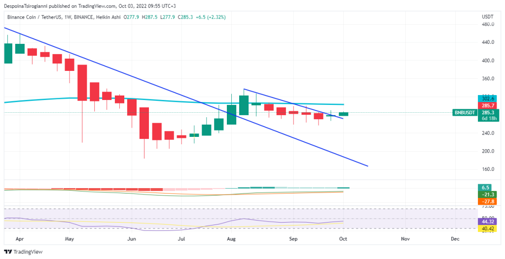 BNB price analysis for 3 October 2022, BNB, the third largest cryptocurrency based on market cap, is in a downtrend since November 2021. The downtrend broke in August but the 50 weekly SMMA stood as resistance. On the first day of this week, it seems that buyers control the price based on the weekly Heikin Ashi Candlestick. The weekly MACD is negative with a positive histogram and the RSI is still under 50.