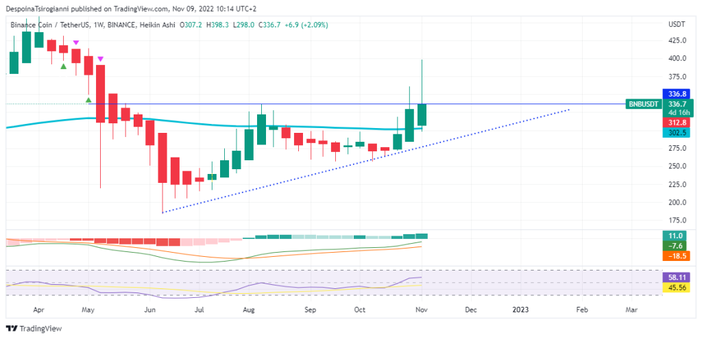 BNB price analysis for 9 November 2022, BNB, the third largest cryptocurrency based on market cap, is in a downtrend since November 2021. The downtrend broke in August but the 50 weekly SMMA stood as resistance. You can read more about BNB price from CoinCodex. On the third day of this week, it seems that pressure tries to balance between buyers and sellers based on the weekly Heikin Ashi Candlestick. Buyers are relatively stronger. The weekly MACD is negative with a positive histogram and the RSI fluctuates above 50.