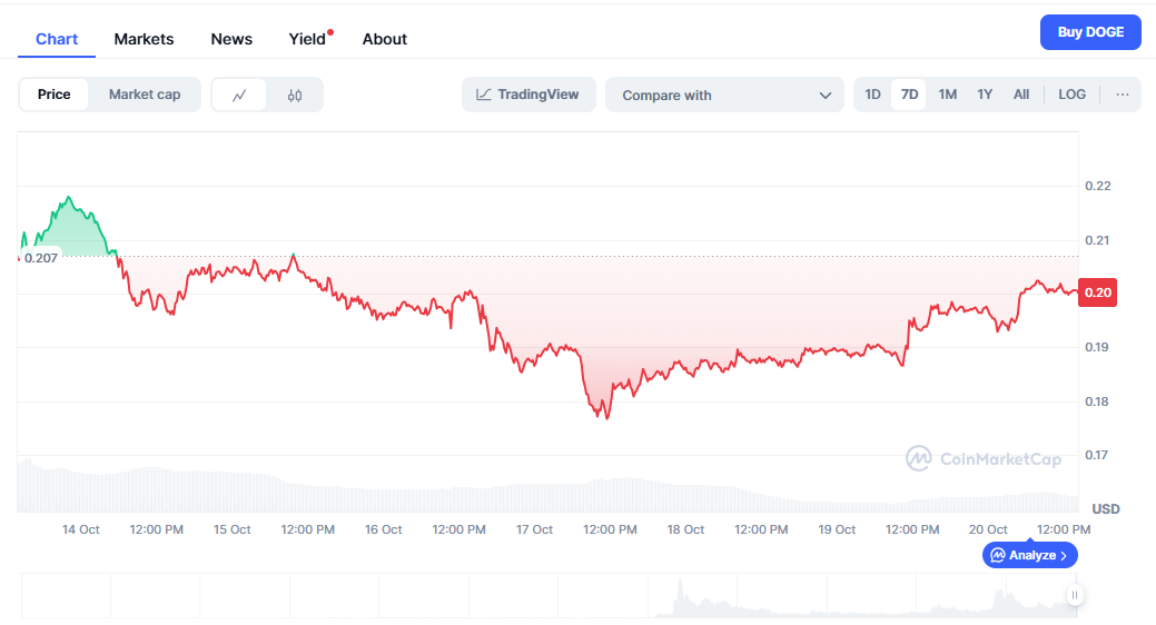 Per CoinMarketCap, the memecoin has been trading between $0.17 and $0.21 in the last week. In the event that the Dogecoin price continues climb upwards, it might approach the upper band and break out.