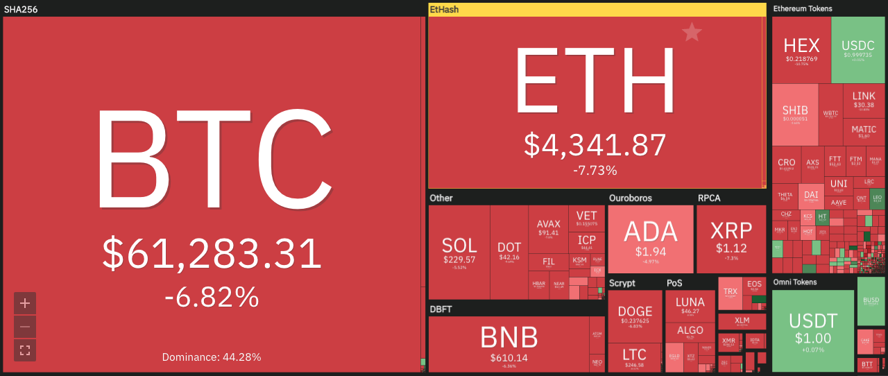 According to the cryptocurrency heatmap by Coin360, the overall market is trading in the red zone. Bitcoin and Ethereum have lost 6.82% and 7.7% respectively. Ripple (XRP) and Binance Coin (BNB) are the worst losers of the day after dropping by more than 7.5%.