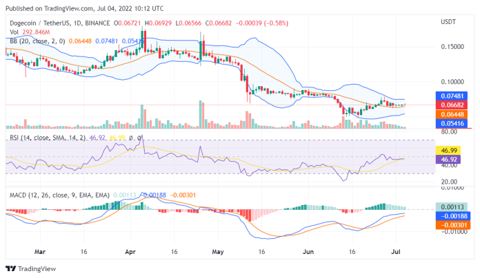 Dogecoin price analysis for July 04, 2022, comes on a sluggish note for the world’s biggest meme coin as we can confirm that the token has surged by around 1.84% in the last 24 hours and investors can expect higher prices in the near future if the buying volume continues to increase for the meme coin. Furthermore, as noted in our DOGE price analysis for July 3, 2022, the meme coin has been trying to breach the $0.07 resistance but hasn’t been able to do so. It seems that in order to reclaim this region, the bulls need to take over once again and the $0.06 price support needs to hold.