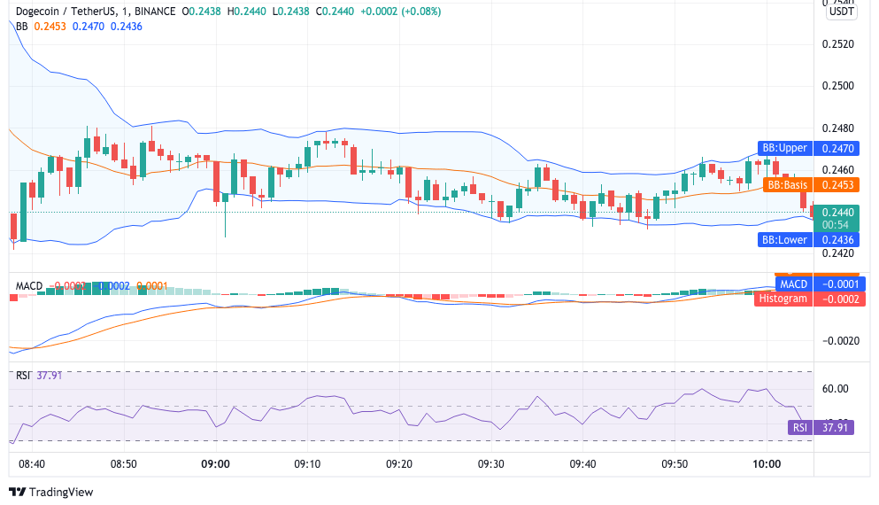The price of DOGE/USD has risen by about 5% owing to a rise in volatility, with the Bollinger bands coming into conflict.