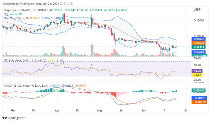 Dogecoin price analysis on the daily chart for June 24, 2022, will consider the data presented by 3 major indicators on the daily chart below.