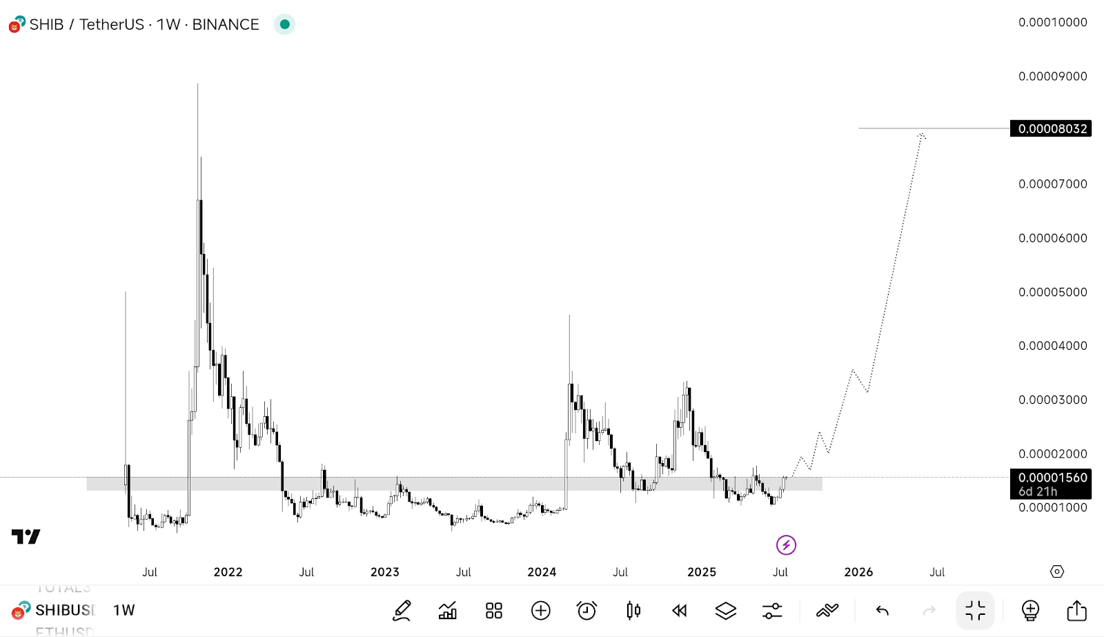 The meme coin already delivered a solid 16% gain over the past month, but according to analyst Friedrich, the real fireworks haven’t started yet. SHIB needs to punch through $0.000017 resistance to trigger what CW calls “big upside” potential.