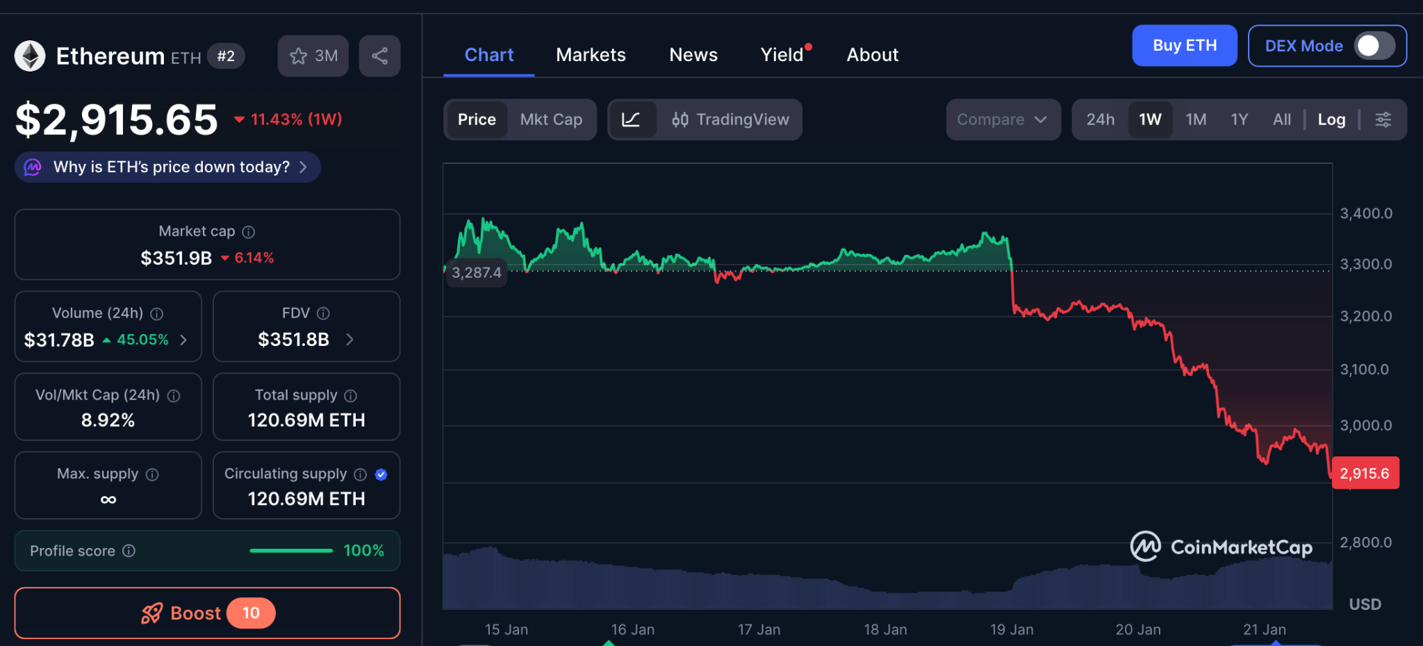 Ethereum powers most DeFi and NFT activity, and remains a blue-chip cryptocurrency for the foreseeable future. But from an investment perspective, it is unlikely to yield much upside. As per coinmarketcap, ETH has seen a massive 100,000% increase since launch – returns that will prove practically impossible to replicate. Moreover, it’s down 11% weekly, dropping to $2,915.