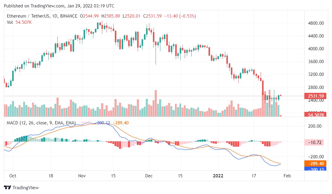 Ethereum price analysis on the daily chart suggests that the ETH token is aiming for $2.6K, but the struggle between bulls and bears continues to push the prices lower. $2.5K is an important price level for Ethereum, as seen in our previous ETH price analysis for Jan 23, 2022.