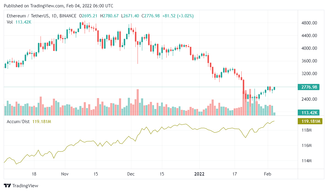 As per our Ethereum price analysis for Feb 2, 2022, Ethereum was unable to break above $2.8K. It is important for ETH to break into the $3K region and reclaim $3.3K, which was lost recently, as per our ETH price analysis on Jan 17, 2022. The daily candle for Feb 4 started the day at a price of $2695 and reached a daily high of $2780. Furthermore, the token fell to a daily low of $2671.