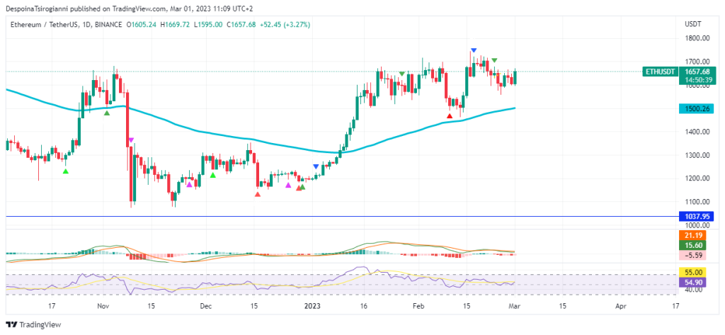 Ethereum price analysis for 1 March 2023, Ethereum, the second-largest cryptocurrency based on market cap, is in a downtrend since November 2021. You can read more about Ethereum price from CoinCodex. On the third day of this week, it seems that pressure tries to balance between buyers and sellers based on the weekly Heikin Ashi Candlestick. The weekly MACD is still negative but forms a positive histogram. The weekly RSI fluctuates over 50, and the price is still under the 50 SMMA line.