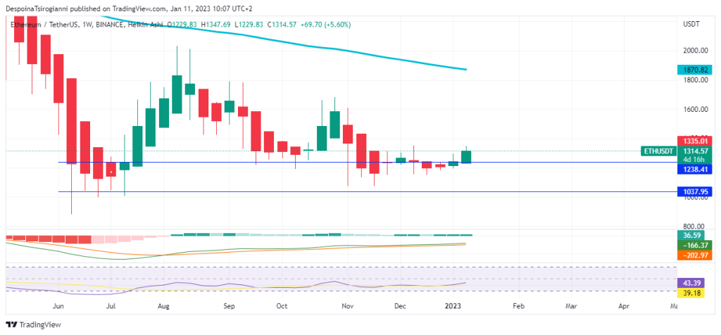 Ethereum price analysis for 11 January 2023, Ethereum, the second-largest cryptocurrency based on market cap, is in a downtrend since November 2021. You can read more about Ethereum price from CoinCodex. On the third day of this week, it seems that buyers try to control the price based on the weekly Heikin Ashi Candlestick. The weekly MACD is still negative but forms a positive histogram. The weekly RSI fluctuates below 50, and the price is still under the 50 SMMA line.