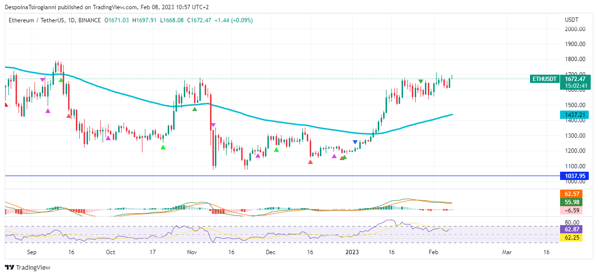 Ethereum price analysis for 8 February 2023, Ethereum, the second-largest cryptocurrency based on market cap, is in a downtrend since November 2021. You can read more about Ethereum price from CoinCodex. On the third day of this week, it seems that buyers try to control the price based on the weekly Heikin Ashi Candlestick. The weekly MACD is still negative but forms a positive histogram. The weekly RSI fluctuates over 50, and the price is still under the 50 SMMA line.