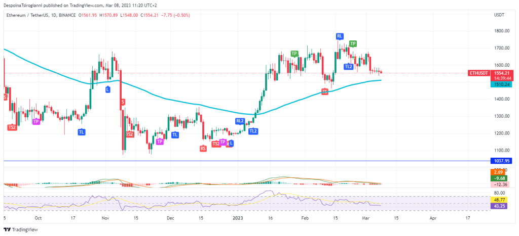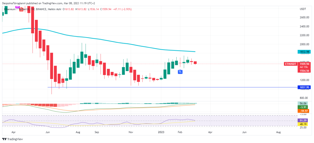 Ethereum price analysis for 8 March 2023, Ethereum, the second-largest cryptocurrency based on market cap, is in a downtrend since November 2021. You can read more about Ethereum price from CoinCodex. On the third day of this week, it seems that sellers try to take control of the price based on the weekly Heikin Ashi Candlestick. The weekly MACD is still negative but forms a positive histogram. The weekly RSI fluctuates over 50, and the price is still under the 50 SMMA line.