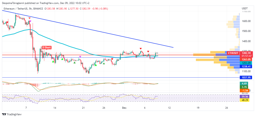 In the 5-hour chart, Ethereum fluctuates over the 50 SMMA line ($1253.09). Moreover, the Volume Profile indicator determines $1282.59 as a strong trading area that has been surpassed. The price achieved the previous resistance areas once again.