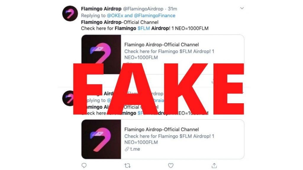 There is currently a Flamingo airdrop scam which asks participants to send their NEO tokens to a “designated contribution address” where you can get FLM tokens at a rate of 1 NEO=1,000 FLM.