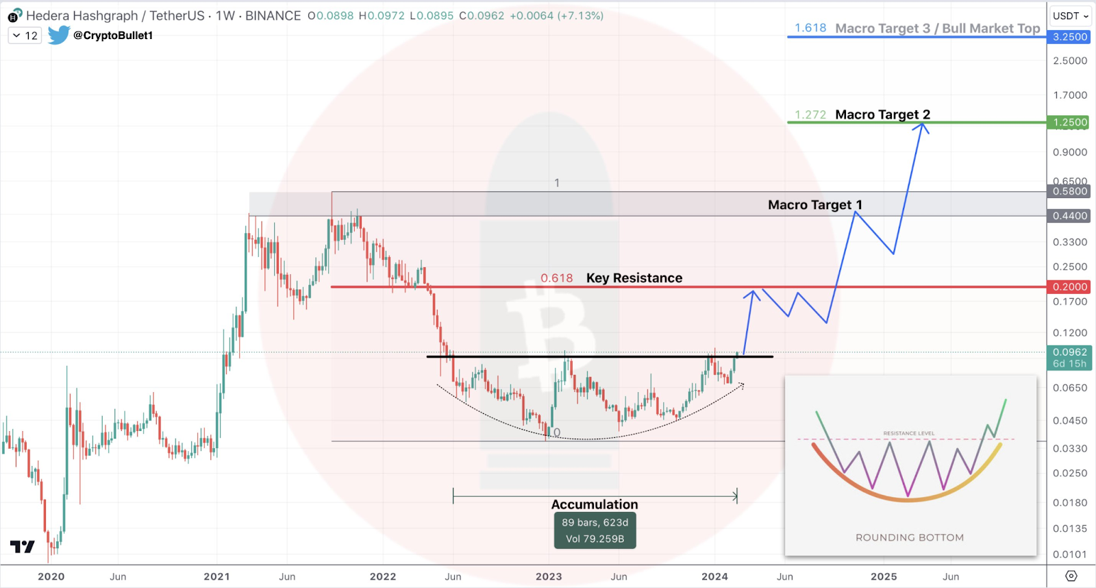 HBAR has been consolidating under $0.10 for 620 days. This has created a strong rounding bottom pattern for long-term accumulation. The key resistance is at $0.20, and once broken, it could have upside momentum. Macro targets are at $0.44, $1.25, and an ambitious $3.25.