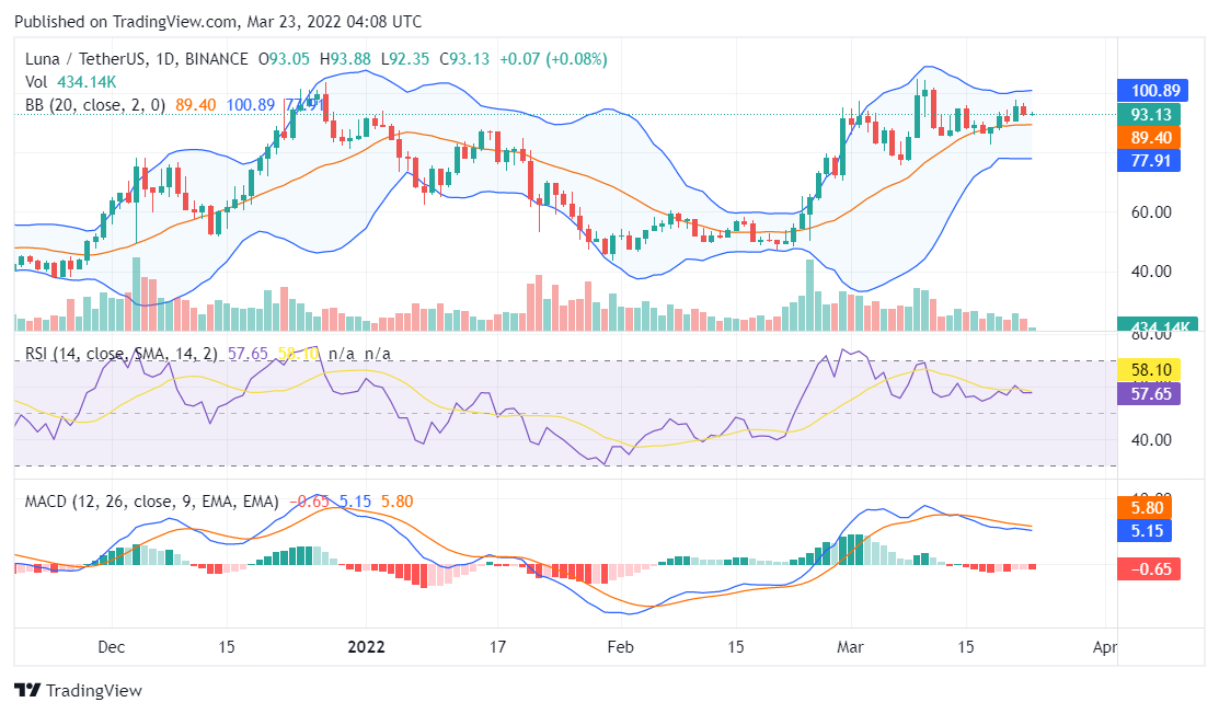 The LUNA price analysis for March 23, 2022, ends on a bearish note for the token as chances of breaking $96 price resistance are too low.