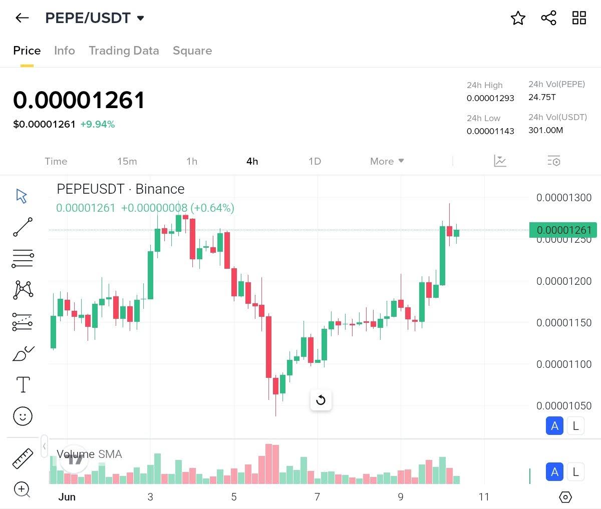 Over the past week, the PEPE price has experienced a correction that has left investors in confusion. However, in the past 24 hours, it has shown signs of recovery after its recent dip. It is currently trading at $0.00001261, up nearly 10% in the last 24 hours.