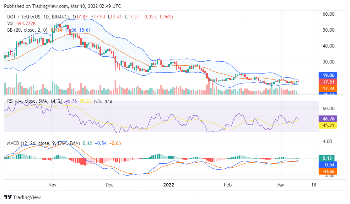 Polkadot price analysis for March 10, 2022, opens on a sluggish note for the token as it has continuously failed to break above the $18 price resistance which is a critical point in the price trajectory of the token. Moreover, as noted in our DOT price analysis for March 9, 2022, the token reached as high as $18.09 but was unable to turn this resistance into a support level.