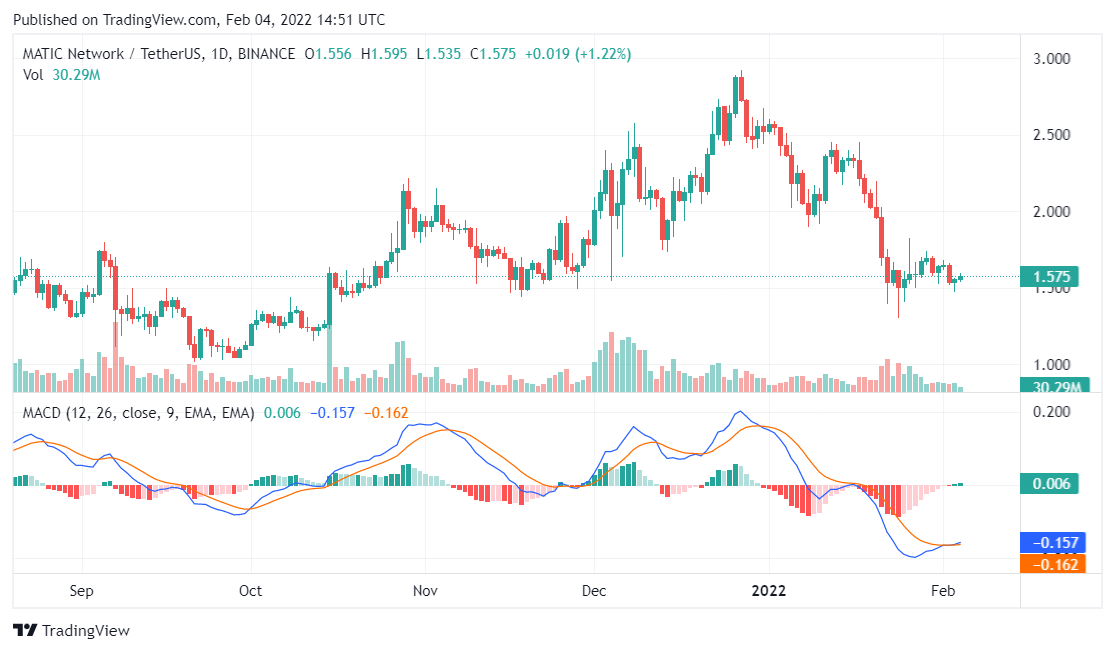 Polygon price analysis for Feb 4 comes with a second consecutive green candle for the token on the daily chart. Moreover, the nearest support for Polygon rests at $1.52 while the price of 1 MATIC at the time of writing stands at $1.575. We saw MATIC fall below another important support of $1.6 as per our Polygon price analysis for Jan 30, 2022.