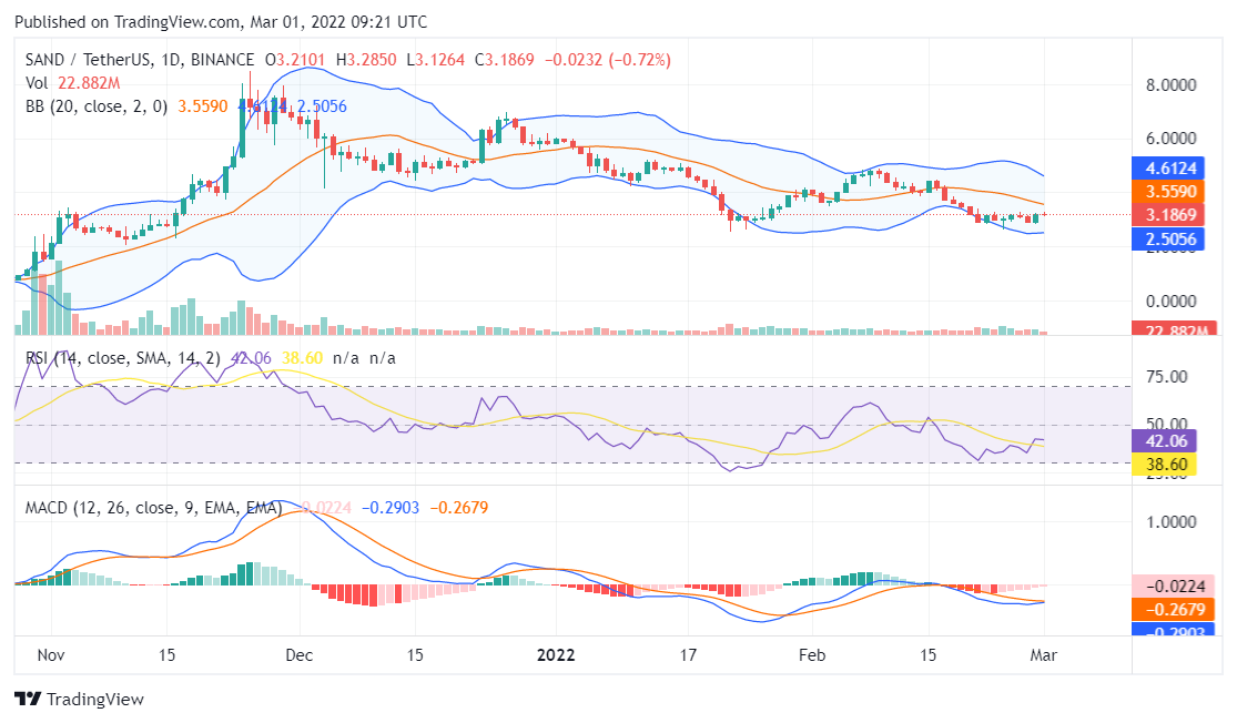SAND price analysis for March 1, 2022, comes on a bullish note as the token has surged nearly 8.5% in the last 24 hours. Moreover, it is also important to note that the $3 price level was an important resistance region, as noted in our The Sandbox price analysis for February 28. It can be said that the token has turned this price region into support, and investors are safe if SAND holds above $3.