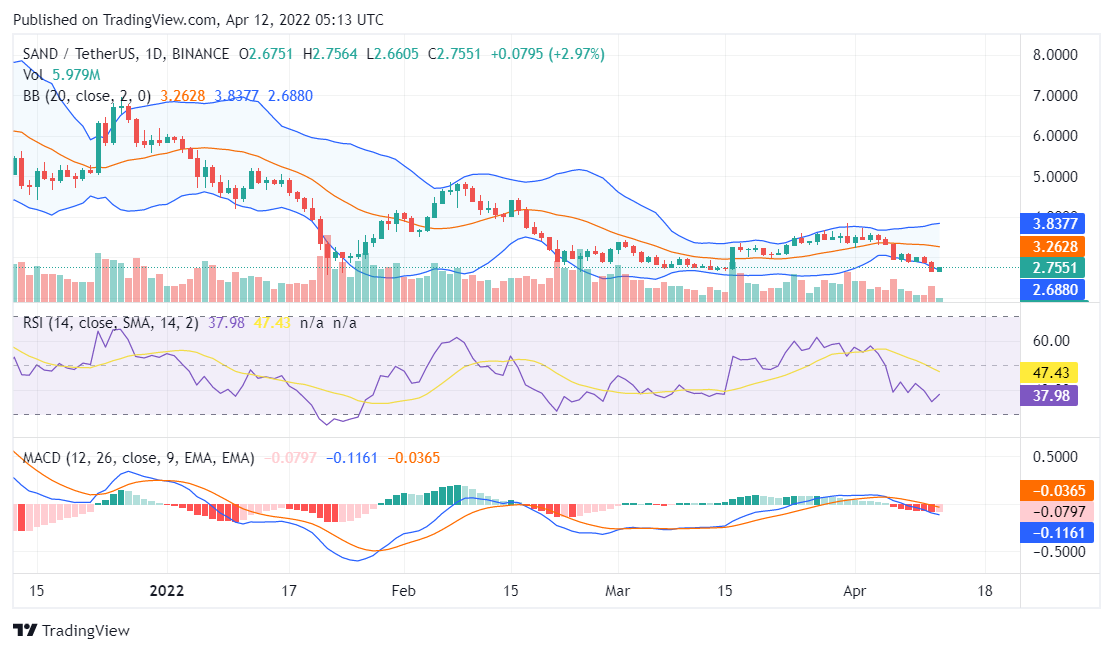 The daily candle for SAND opened at a price of $2.67 and reached a daily high of $2.756. Also, the daily low for the token stands at $2.66, and the price of 1 SAND at the time of writing is $2.755.