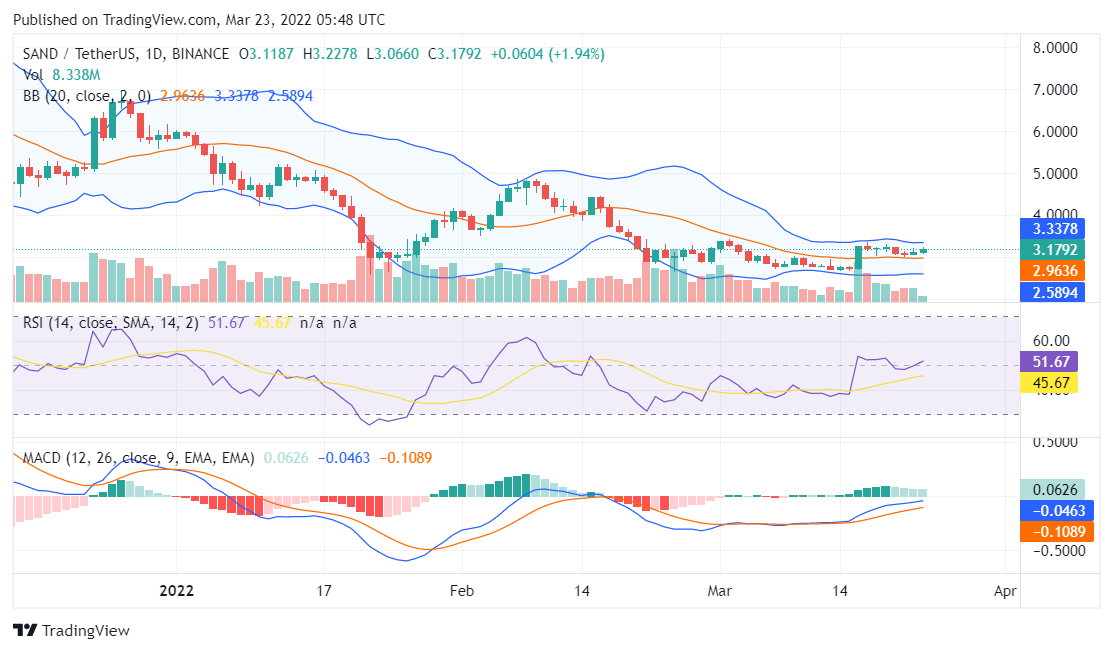 SAND price analysis for March 23, 2022, confirms that the metaverse token remains strong at the $3.18 price level which is a minor support, despite a selling pressure being prevalent. On the other hand, it is also important to note that the metaverse token has a strong resistance at $3.25, as noted in our SAND price analysis for March 22, 2022. The token has been maintaining another strong support at the $3 price level.