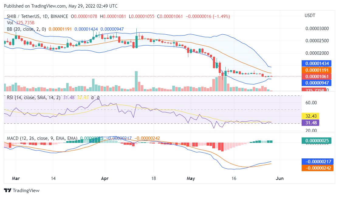 Shiba Inu price analysis for May 29, 2022, comes on a bearish note for the token with low chances of breaking the $0.000011 price region in the near future. It seems that there is a significant drop in the buying pressure which has caused the price action to fail to break out of the $0.000011 price region. As noted in our SHIB price analysis for May 28, 2022, the meme coin has major support below the $0.000010 price level which needs to hold before the bulls make another attempt to breach $0.000011. There is a major resistance beyond the $0.000012 price level.