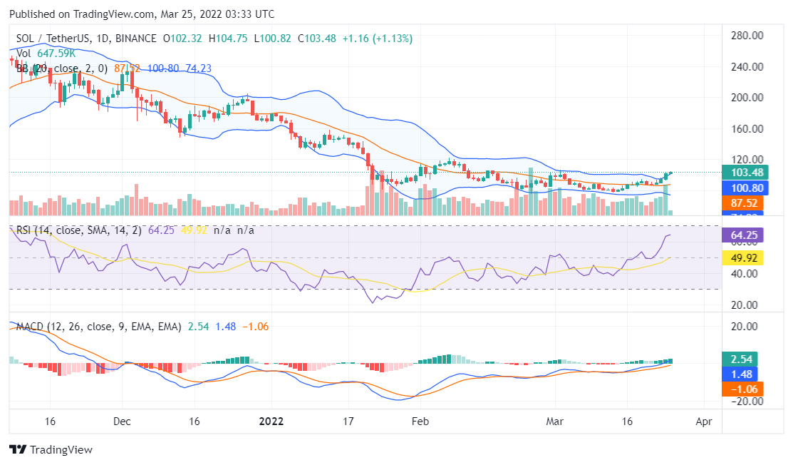 Solana price analysis for March 25, 2022, confirms that the token is holding strong at the $103 price level as chances of the SOL token retaining prices above $100 seem pretty high. Moreover, it is also important to note that as per our SOL price analysis for March 25, 2022, the token might remain above $100 if bulls remain in control of prices. The short-term resistance for SOL is at $105 while support is at $100.
