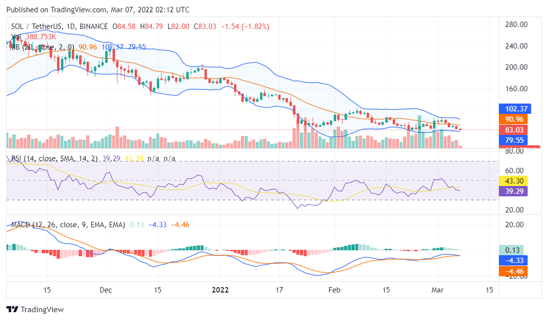 The Solana price analysis on the daily chart for March 7, 2022, concludes that we might see the SOL token below $80 in the coming days if the market doesn’t return to its bullish roots.