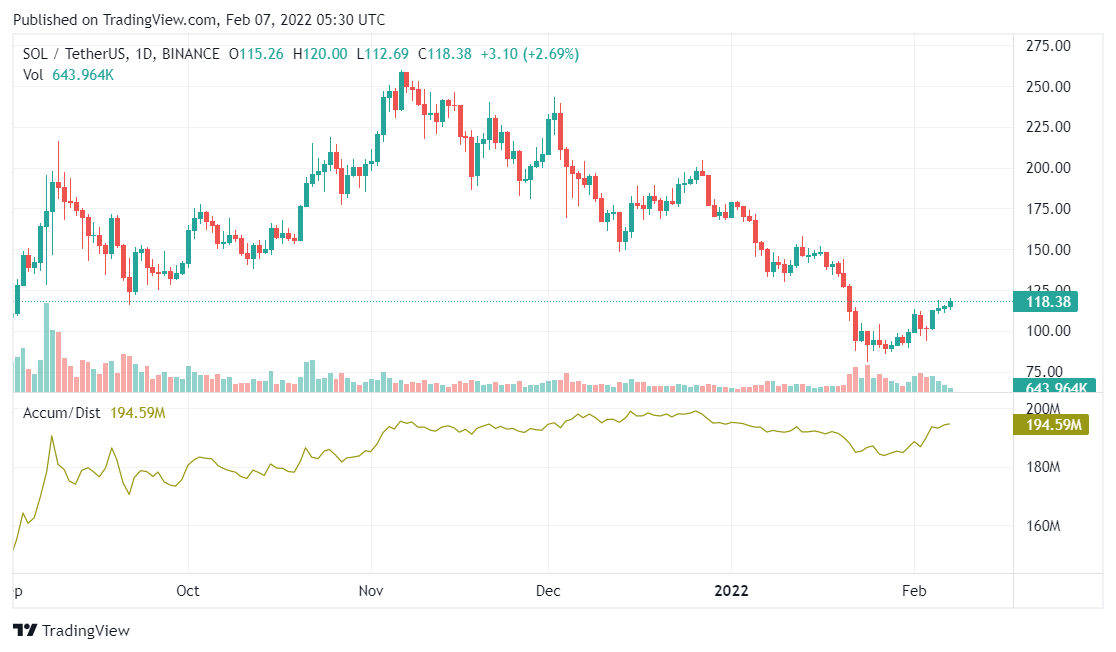 The Solana price analysis for Feb 7, 2022, further shows that the daily candle for SOL opened at a price of $115 and reached a daily high of $120. However, the daily low for the token currently stands at a price of $112.