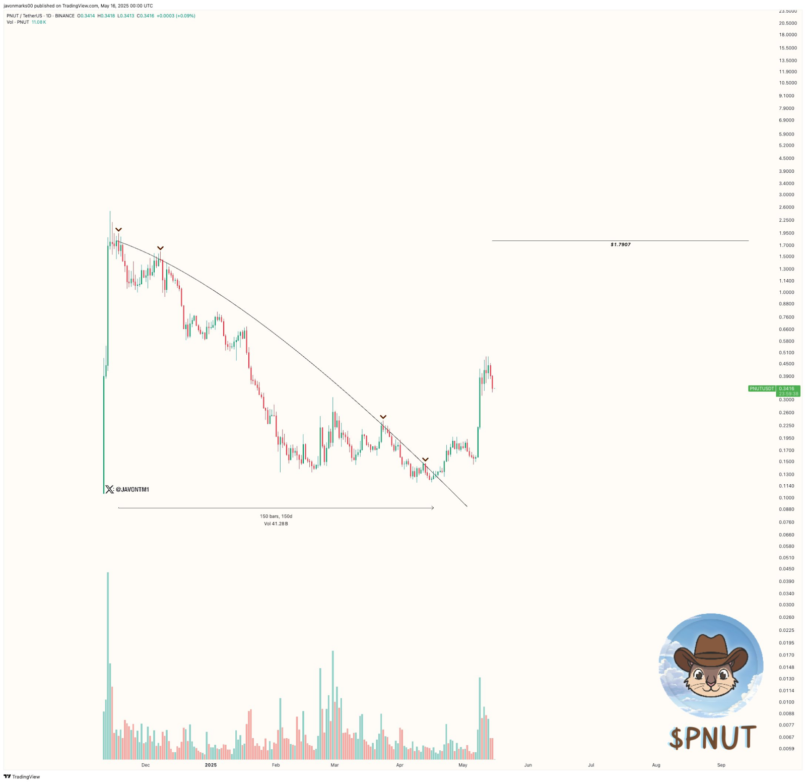 Javon Marks reported on X (formerly Twitter) that Peanut the squirrel (PNUT) has broken key resistance after nearly 150 days, targeting $1.7907 following a 280% price surge. Additionally, Analysts highlight Peanut the squirrel’s (PNUT) technical structure and meme appeal, which have garnered a dedicated following on niche Telegram and Discord groups.