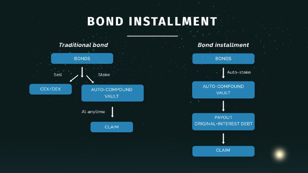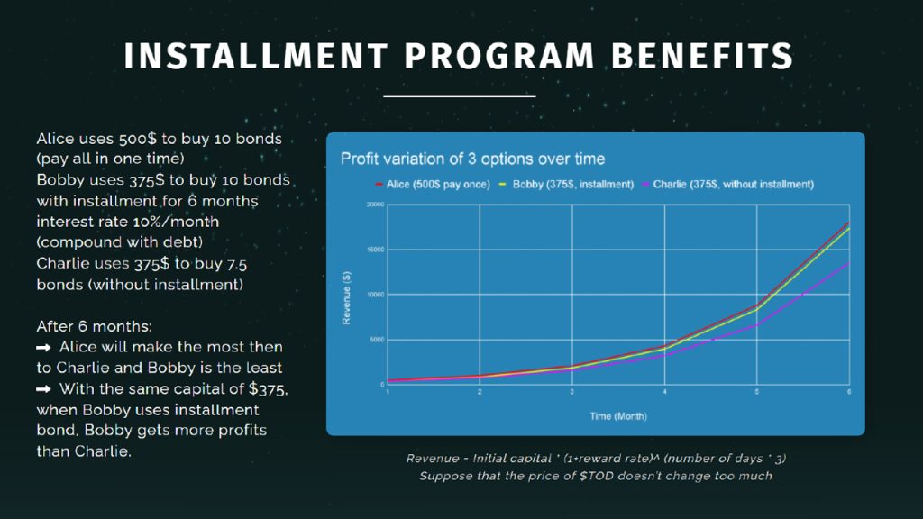 Bond installment permits bonders to purchase more TOD with a specified quantity of assets and pay off the loan later. This form of bond allows users to utilize tiny amounts of cash to purchase more bonds and then profit from auto-compounding staking.