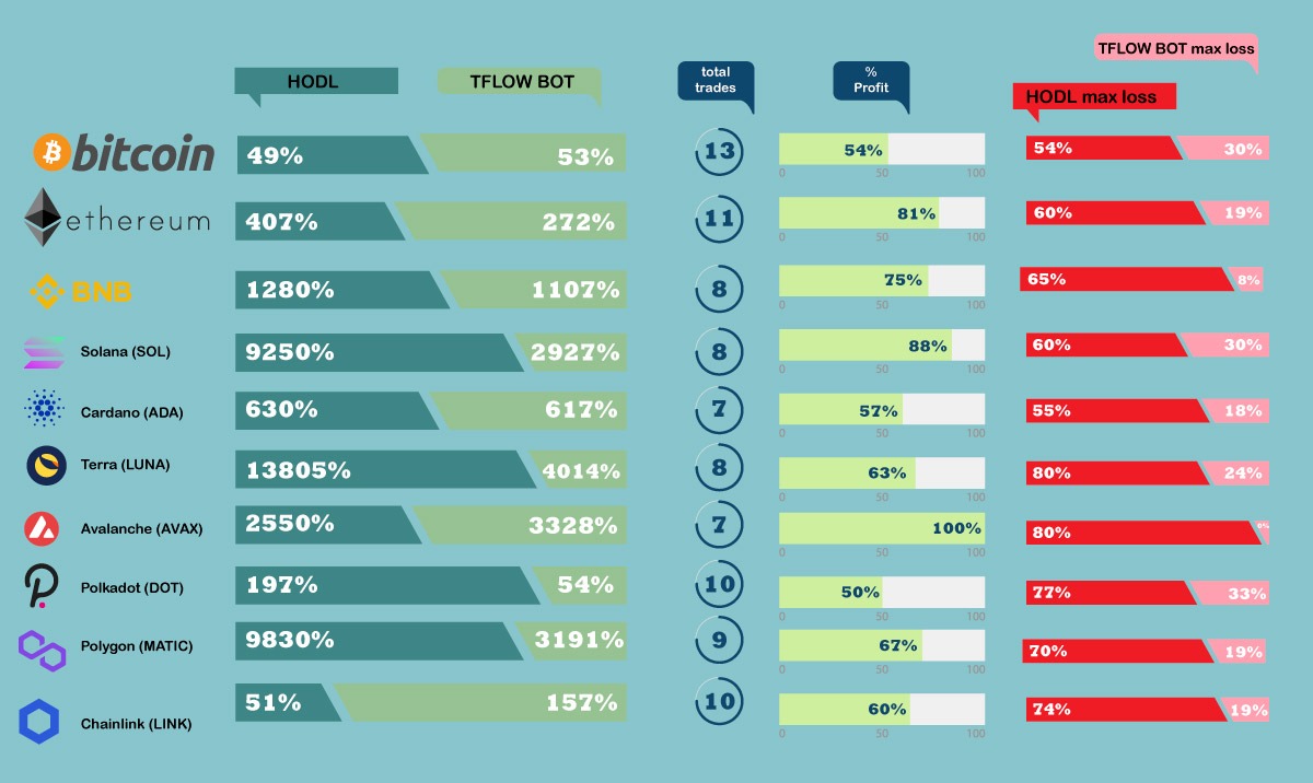 TFLOW is the first Hybrid DeFi platform to provide automated trading services in 15 tokens, notably, BTC, ETH, BNB, FTM, LUNA, NEAR, MATIC, AVAX, AXS, VET, ENJ, SAND, EGLD, SOL, and THETA, paired with USDT and BUSD.