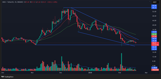 After its massive rally in November, Avalanche faced rejection at $55.4 and reversed, dropping to the $34.5 support. Due to reduced demand, AVAX continued in sideways price action above this level for over a month. Last month, the Avalanche price dropped below this support and has been consolidating between $23.7 and $27.3 for the past two weeks.